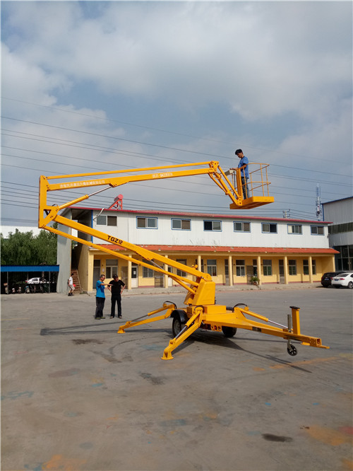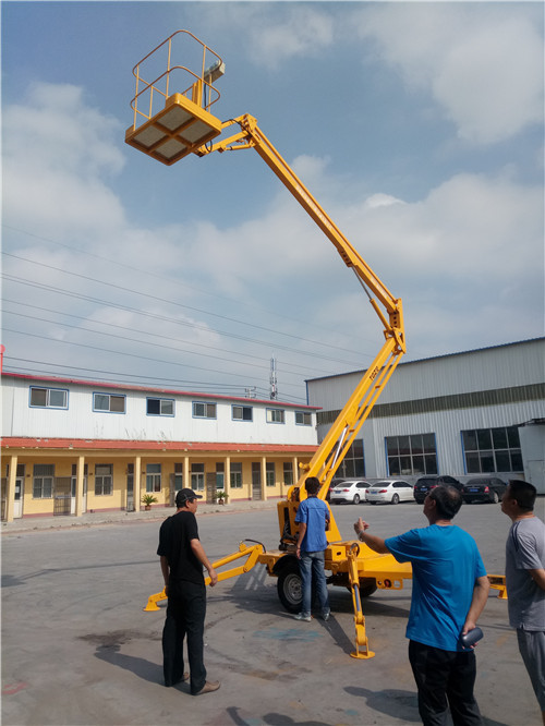 客戶來公司考察,拖車折臂式液壓升降機,升高8-20米,載重260公斤,最大延伸工作距離2-8米